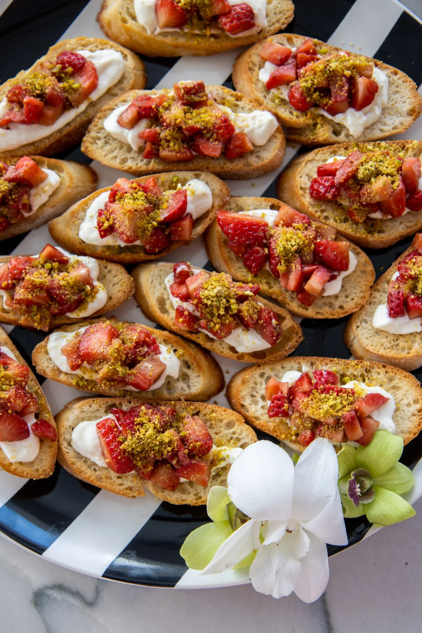 Lemon Ricotta Crostini with Balsamic Strawberries and Pistachio Dust