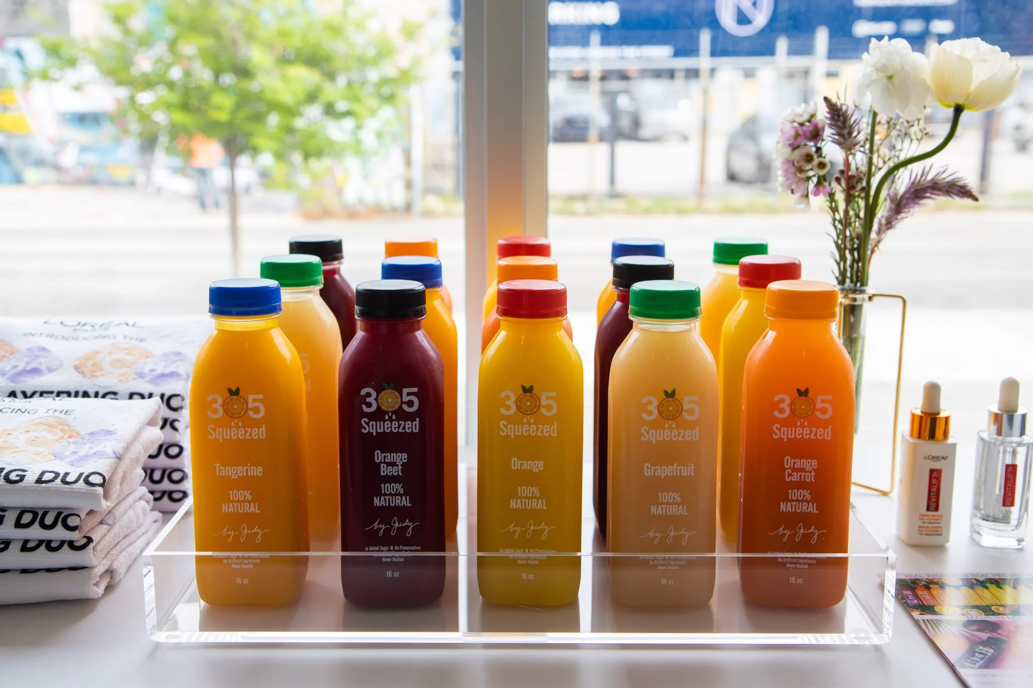 The next day, the group went to Mimi Yoga Studio for a work out and dance lesson! The Rev NY team went ahead of time to pre-set the space with scrunchies for the girls to use, head bands, branded face towels, water bottles and an assortment of fresh squeezed juice from 305 Squeezed. They repurposed the florals from the dinner party so they didn’t go to waste and instantly brightened up the front space to create a welcoming and well branded entry.