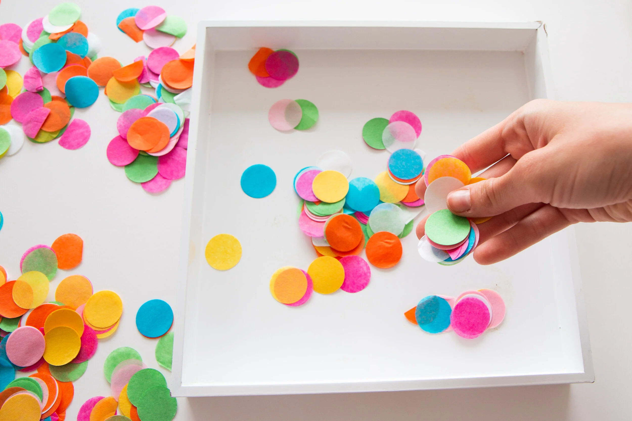Your first step for this DIY is to pick up a tray. You can use any color or shape tray, and any color confetti your heart desires. You just want to ensure that your tray is sealed with no seams that the resin can seep into. I chose a white lacquer tray so my bright confetti would really pop, but I also love the idea of using a black tray with a chunky silver or gold metallic confetti. The possibilities are endless!