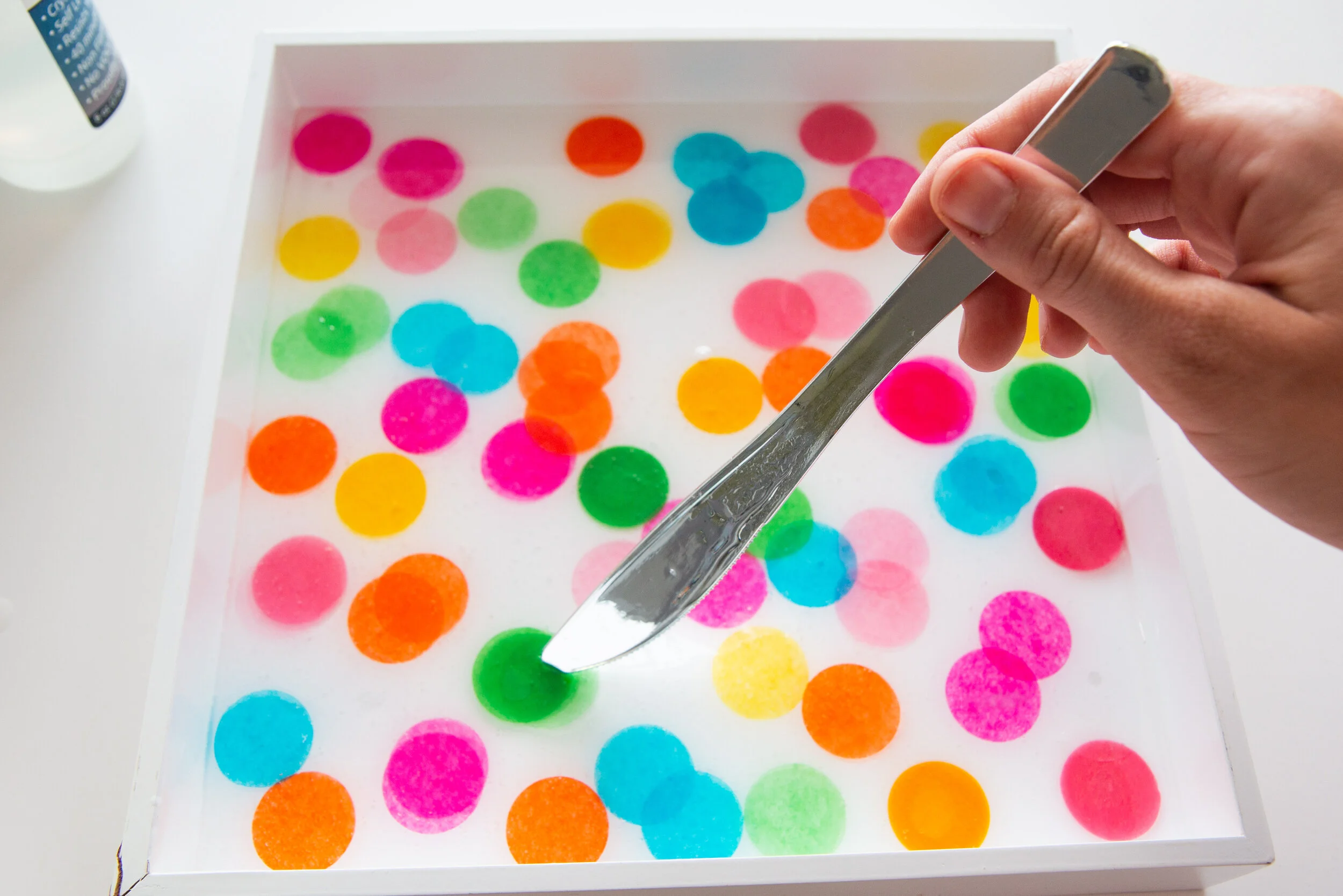Disperse pieces of your confetti across the tray in a single layer. It’s important that not too many pieces are touching each other because once you put in the resin, the confetti will get wet and they will bleed into one another. So for example, don’t put an orange and a green on top of each other because they will bleed together and look brown. Also be sure to remove the confetti that you see folded, because once the resin is in the tray you won’t be able to move the pieces around.