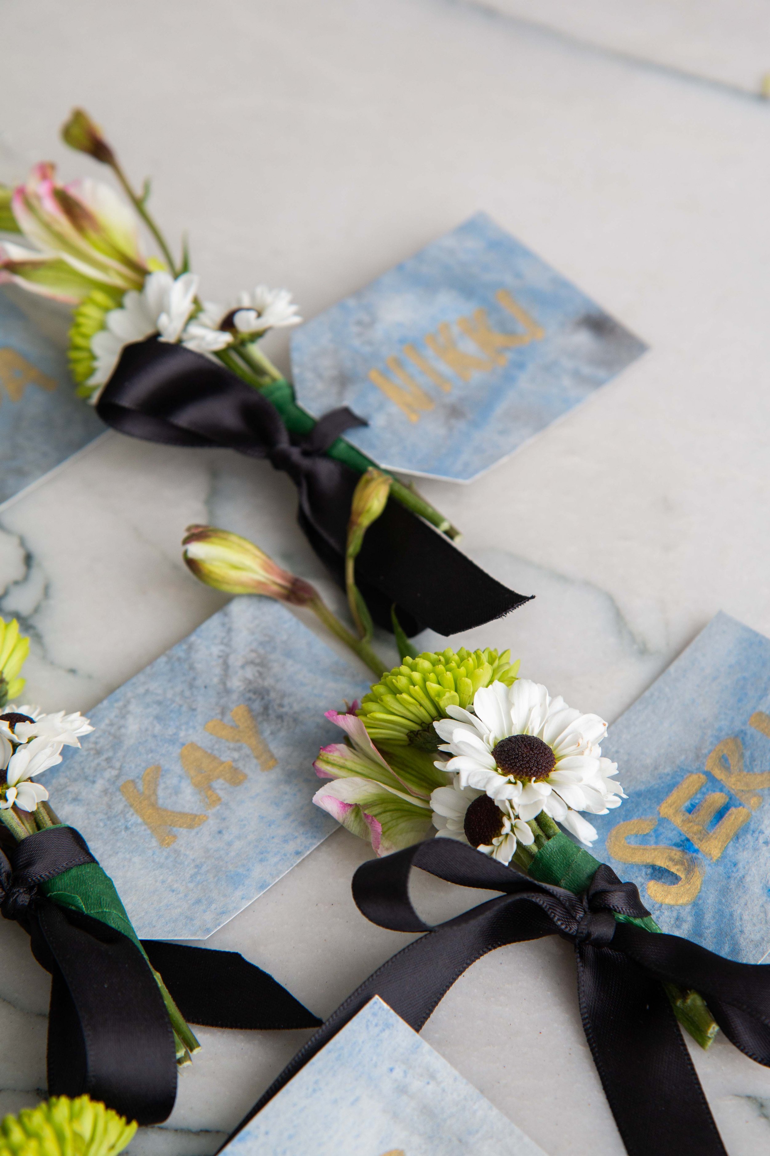 Hole punch your place-card, loop ribbon through, and finally tie your mini bouquets together with a bow