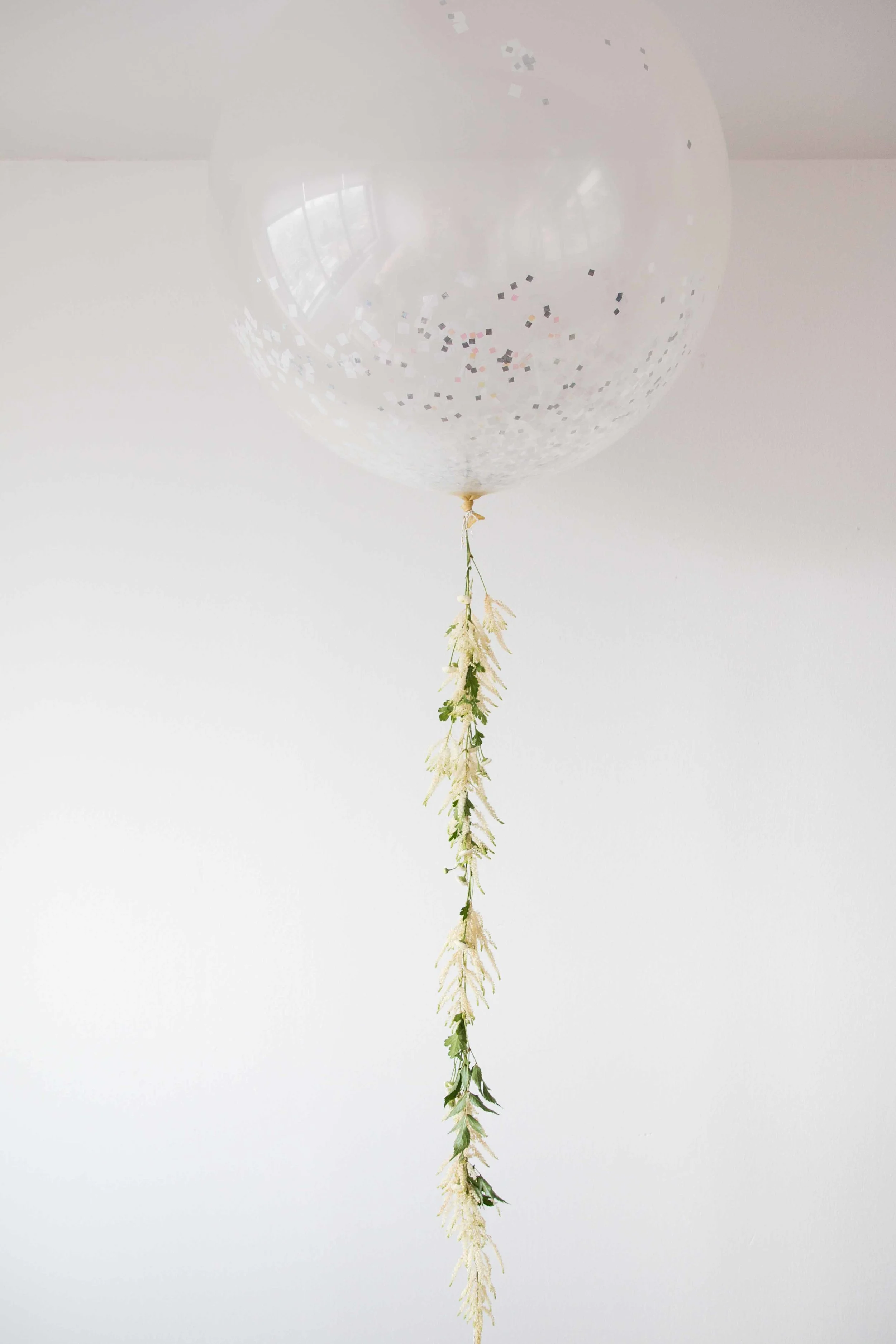 And last but not least, our favorite mini DIY is adding real flowers to your jumbo confetti balloon, which comes with the party box. Grab some lightweight stems, wrap your twine around the branches, and voila! A perfect added touch to wrap up this Flower Power Party.
