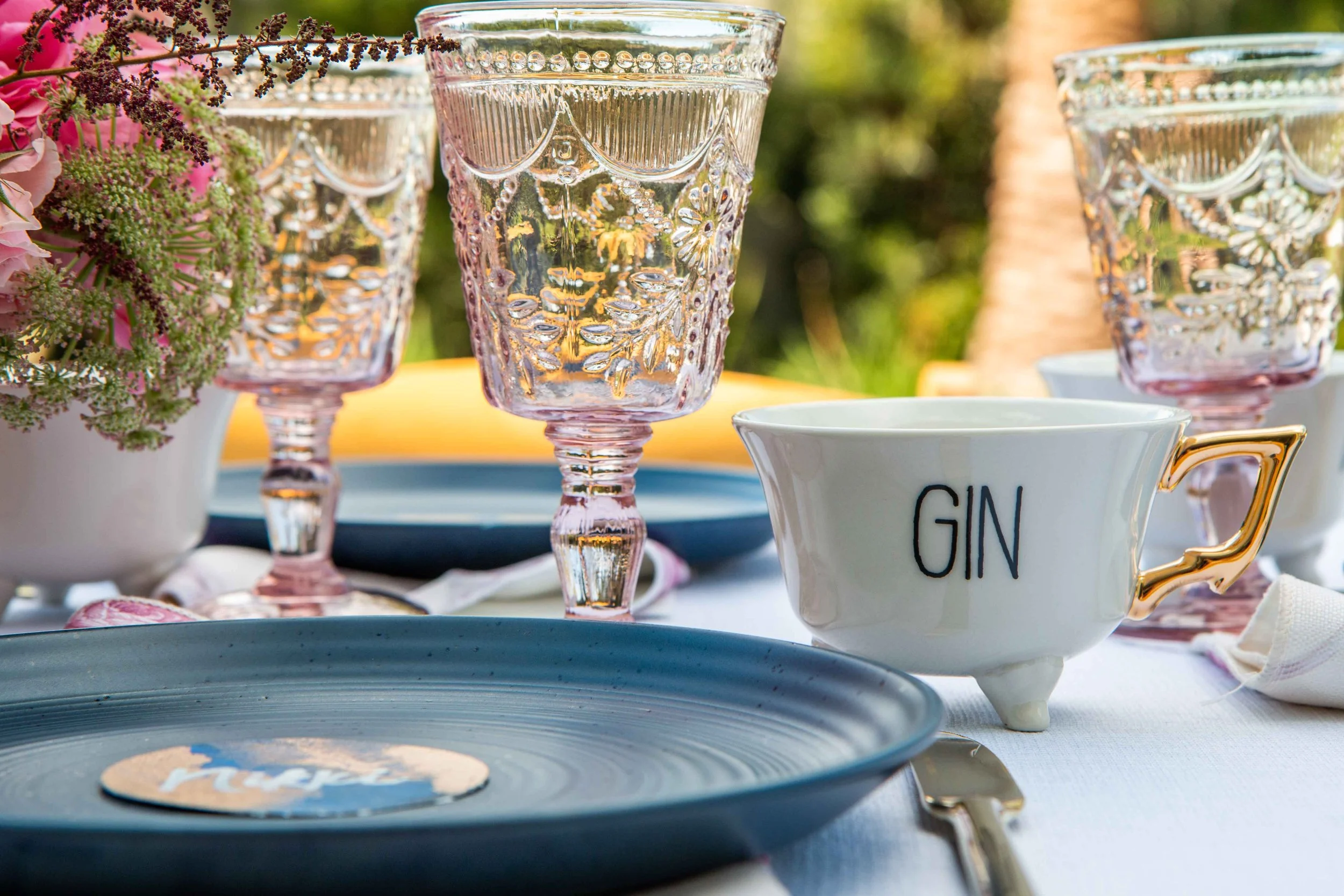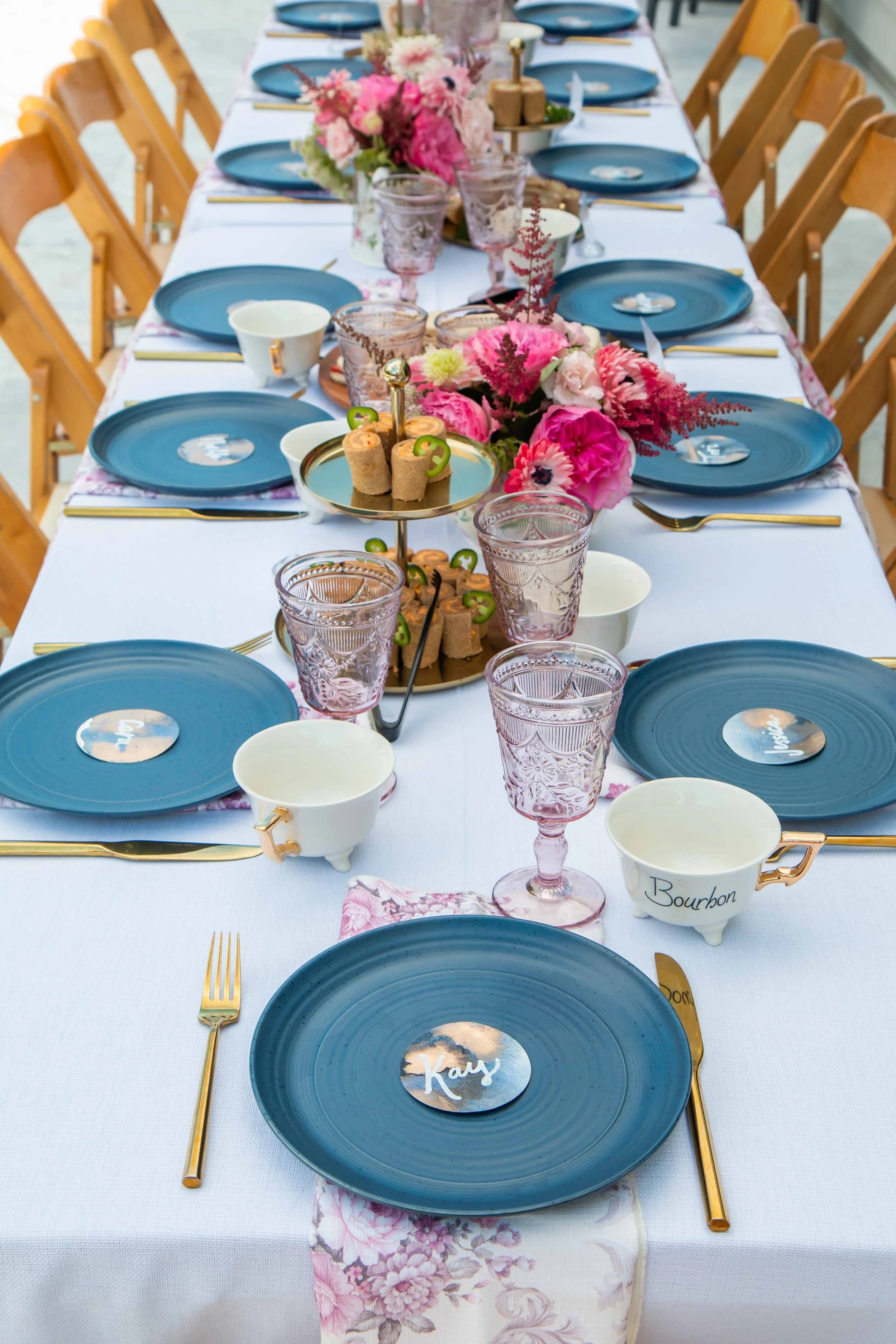 Though I wanted the theme of this Galentine’s Day brunch to be a Tea Party, I didn’t want it to be too floral or frou frou. I wanted an urban, chic tea party vibe. I went with a navy, pink and gold color palette which I felt gave the tablescape some edge and we sourced the most fabulous tea cups that gave away the secret of spiking and then we sent every guest home with their tea cup at the end of the party.