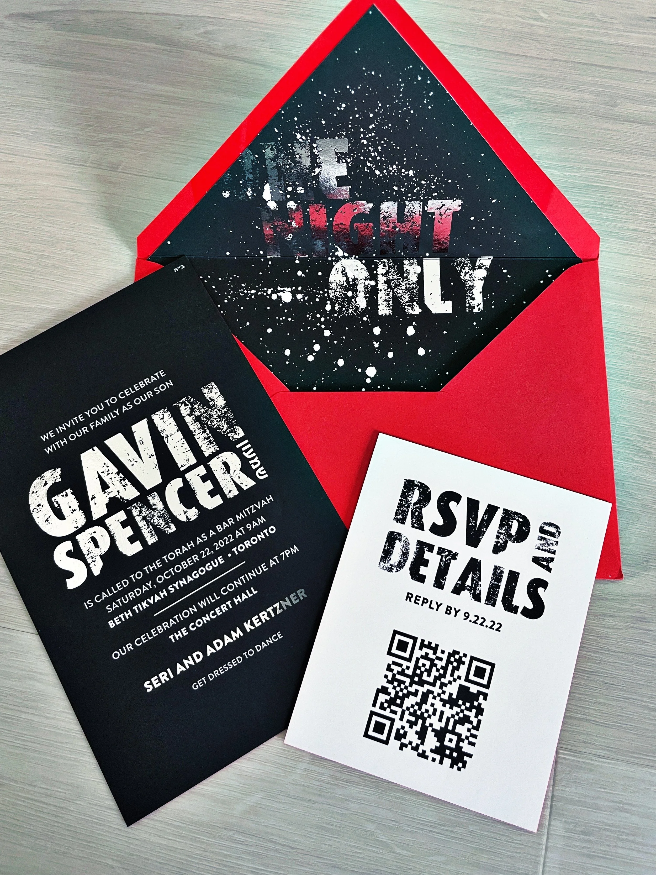 When you entered, it felt like you were walking into a rock concert. Since my son spent a lot of his New York life learning how to DJ, DJing events and keeping up with his love of music through our move to Florida, we made a part of the theme all about a “special performance” that he would do and coined it: ONE NIGHT ONLY 10.22.22 with special guest, DJ Wildman (a name he established after his hockey coach put a sticker on his helmet when he first walked onto the ice back when he was about 7 years old). The theme started with our invitations which were so spot on, designed by my favorite Becca of Suite Paperie. The invite was so subtle but looked so rock n roll. Ugh its so good it hurts. This theme further pulled through custom artwork throughout the venue, a subway train photo booth backdrop, pillows and swag that we were going to give out.
