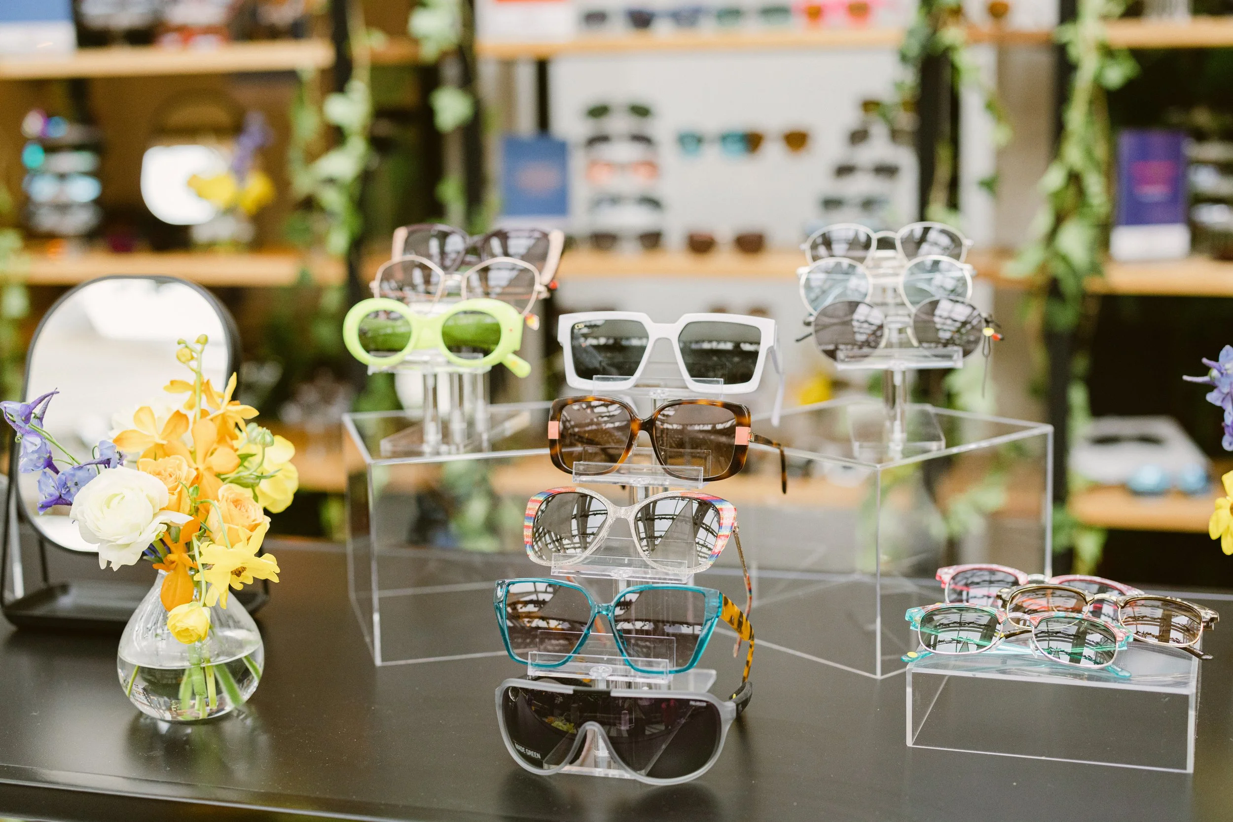 Next up was the product display - which was where we brought in all these fun sunglass styles! We sourced beautiful shelving through Taylor Creative and added in lots of elements to really make the set up feel special such as acrylic risers and displays, ivy, custom signage, vanity mirrors, and of course florals.