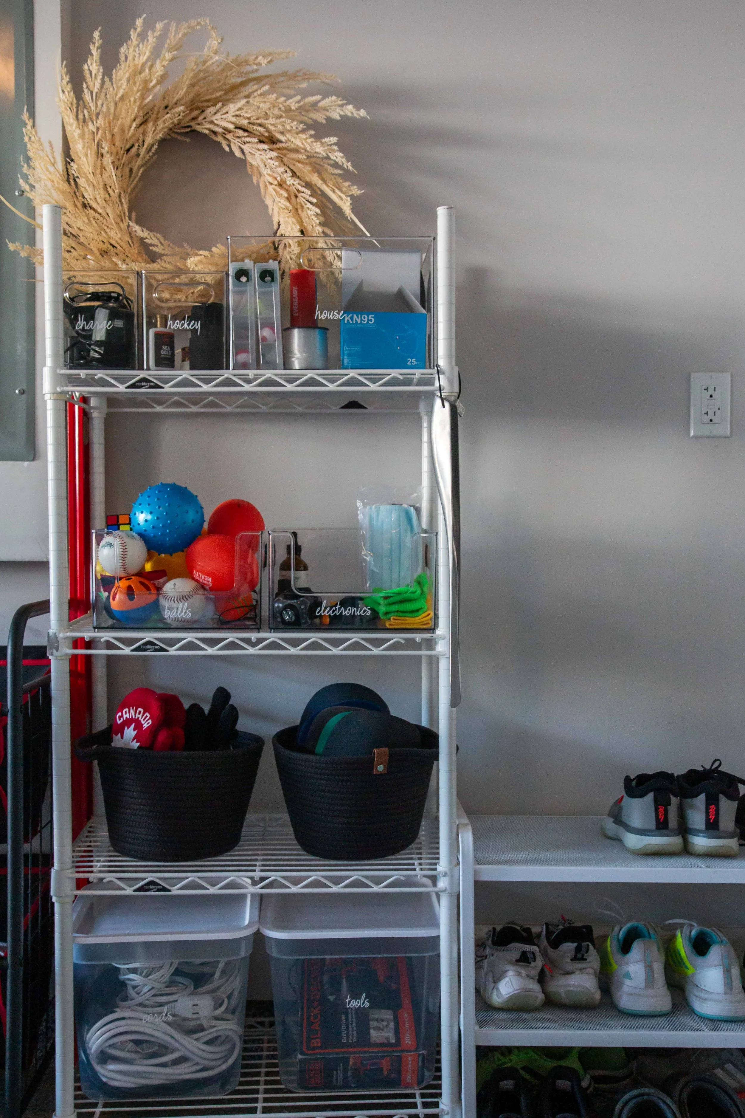 Lastly, I created a station that acts as a grab and go on your way in and out of the garage door entry to the house. This station includes hats, masks, hockey essentials like grip tape, balls, extension cords and flashlights. There is also a shoe rack and extra storage for shoes and sports equipment so my kids can take responsibility for placing their belongings…where they belong.