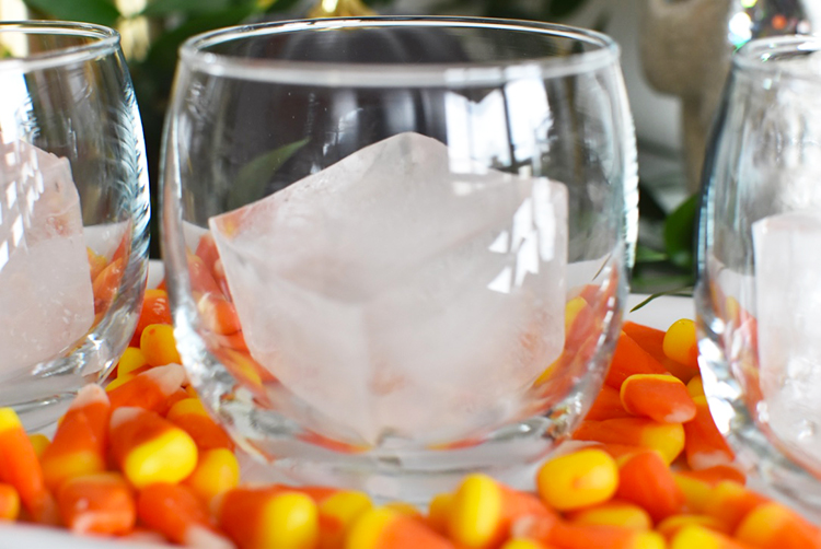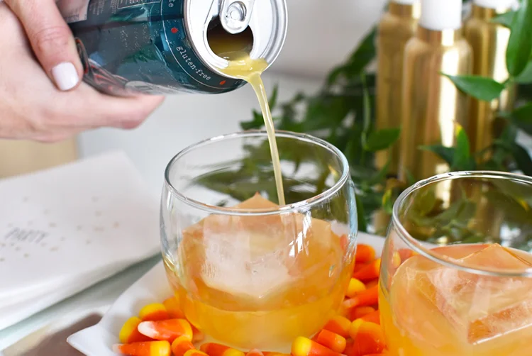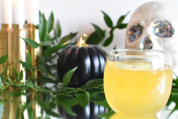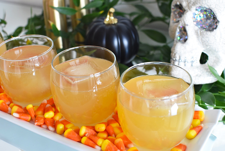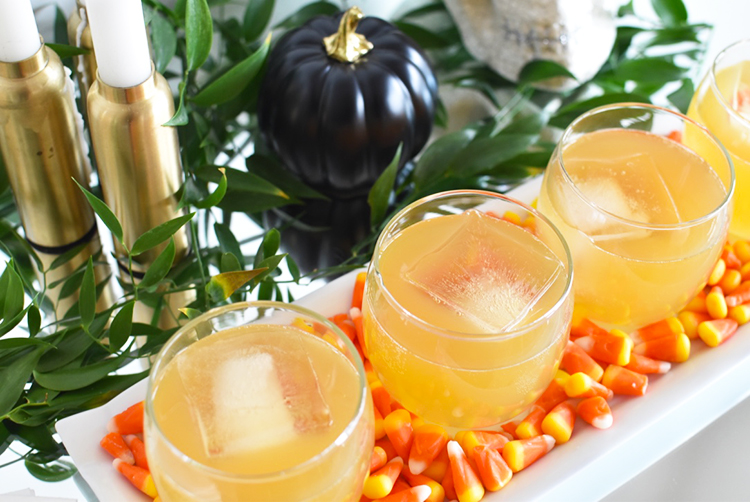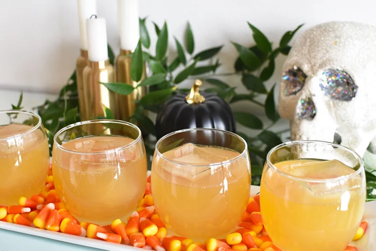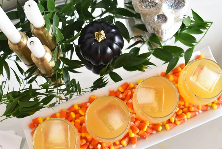 A tip for styling this drink to serve at your Halloween party: I took a simple white tray and lined the bottom of it with some candy corn for a pop of color... how gorgeous is that? And you can't serve a cocktail named the Grave Digger without sticking a glittery skull next to it.