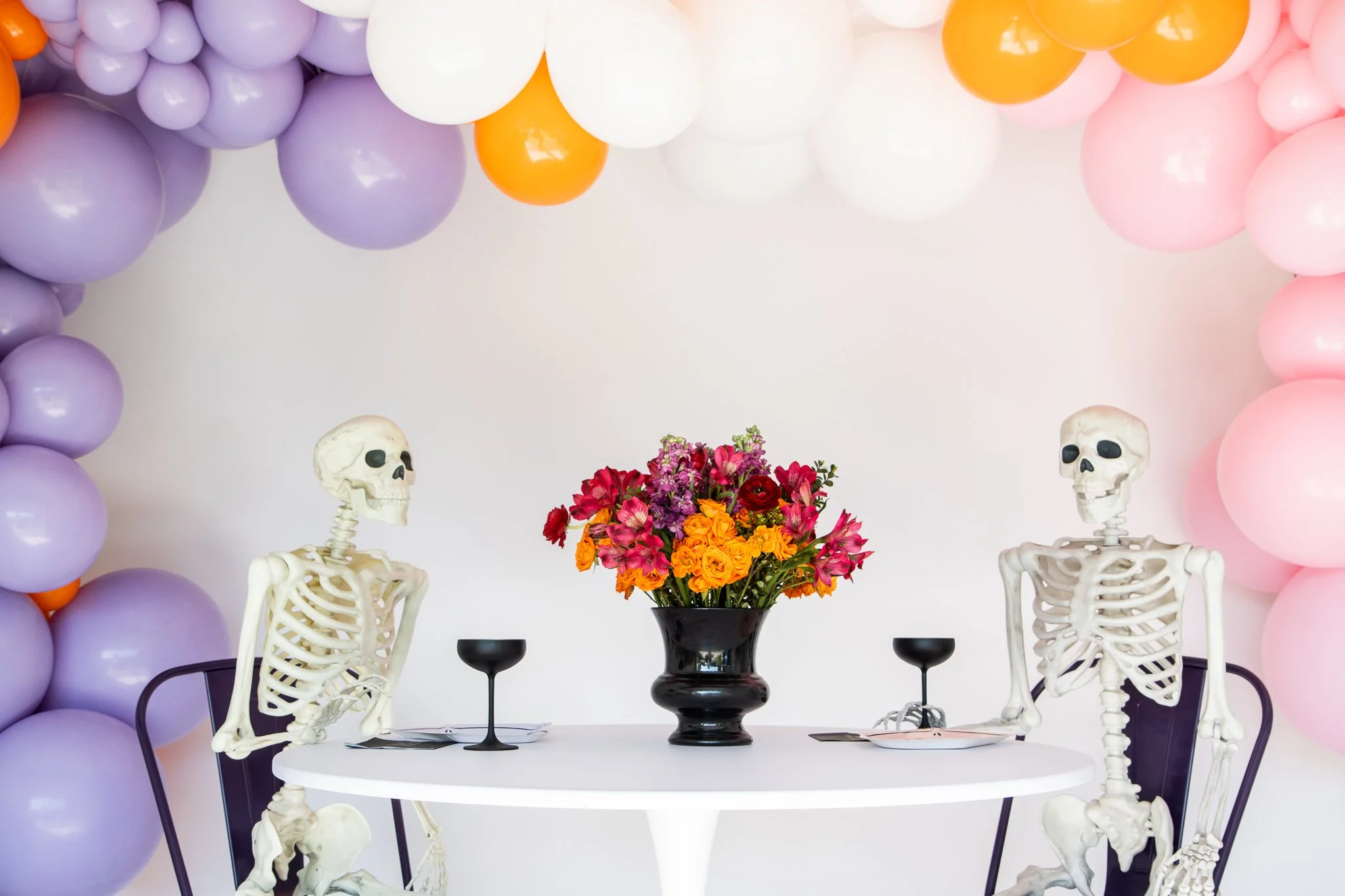 Forget dime-store skeletons — instead, embrace the dark and sophisticated side of Halloween party decorations with an adult gathering that oozes glamour. Think flowing skeleton “guests” and tablecloths adorned with flickering candles in vintage candelabras. Picture goblets filled with crimson cocktails and centerpieces overflowing with deep red roses and calla lilies. And don’t forget the haunting invitations and tableware, which are perfect for setting the tone.