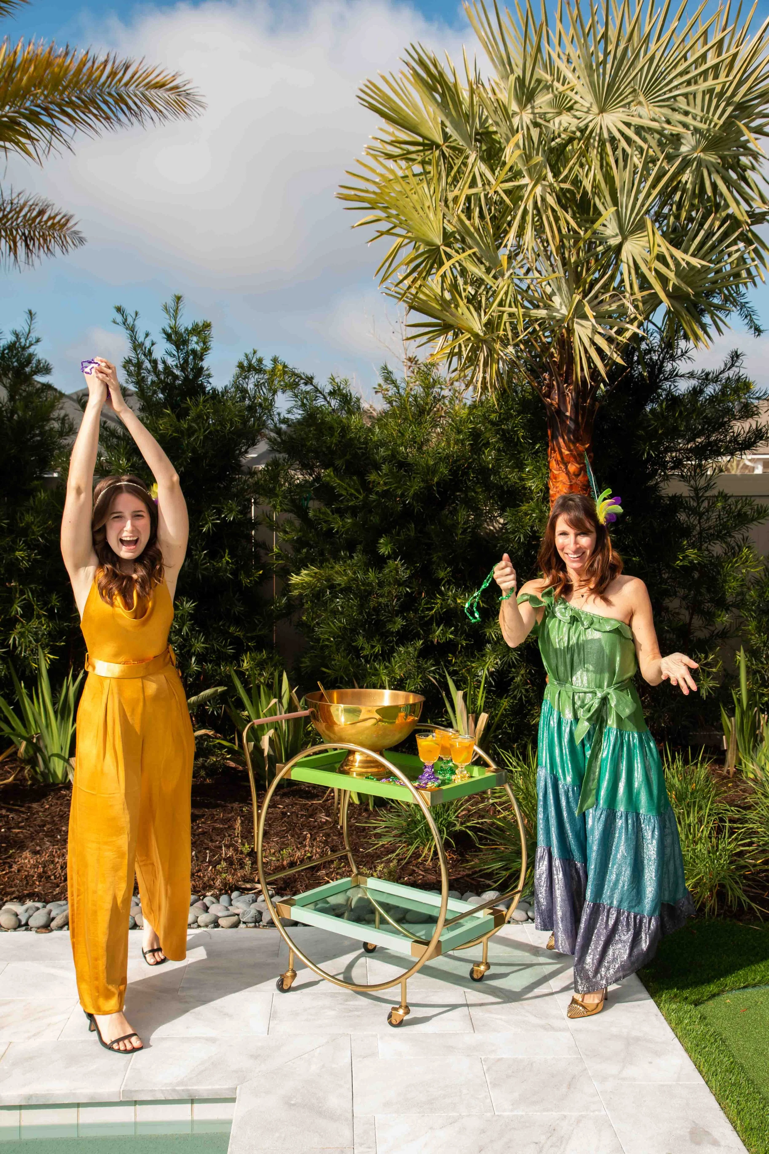 While I’m not traveling to New Orleans or the South of France to celebrate Mardi Gras this year, I am celebrating in the backyard with my best party girls. Natalie and Maggie are all dressed up in the traditional colors with me and Shaylan is behind the scenes stirring up a festive punch and throwing beads at us. Around here, we’ll take any excuse to PARTY!