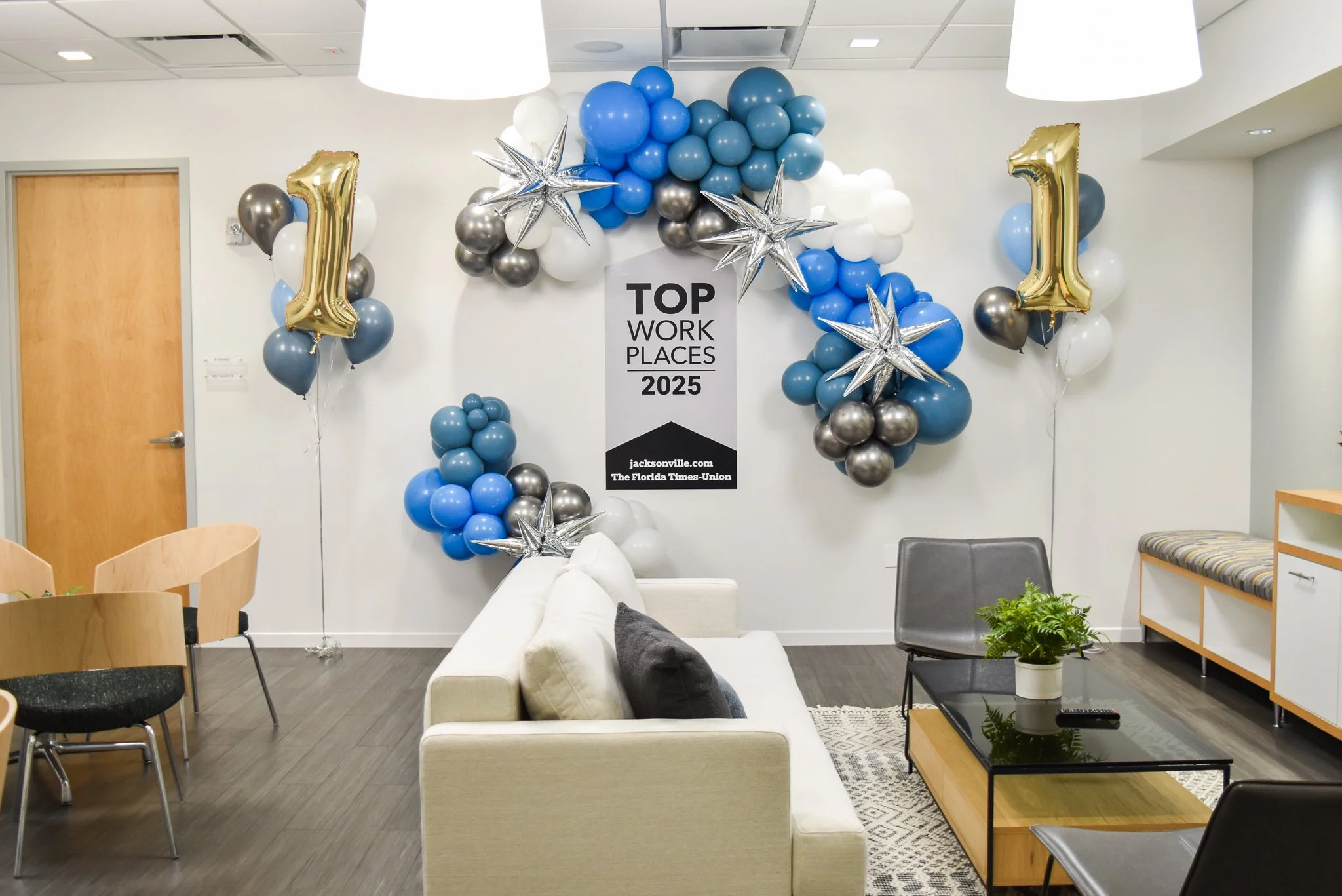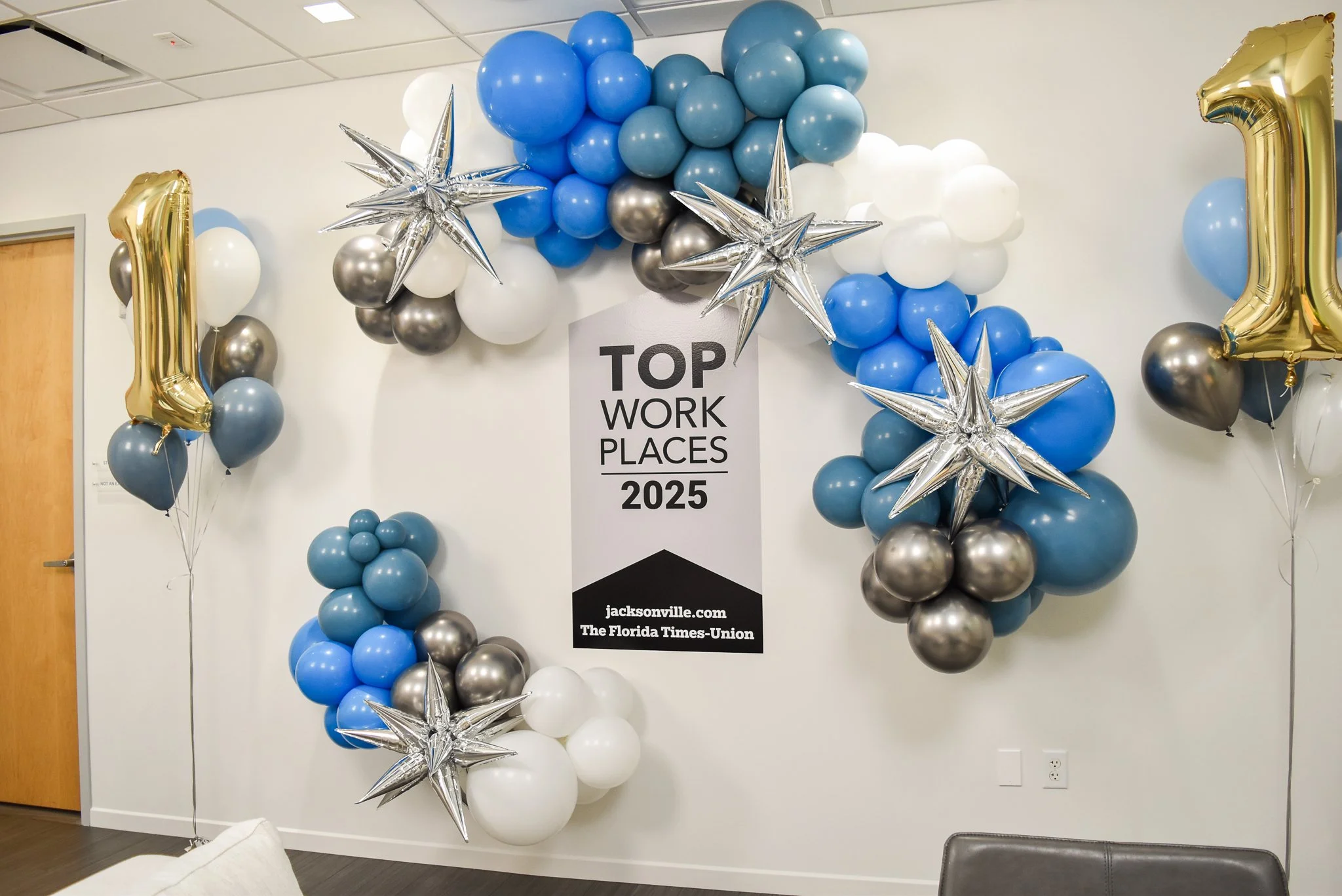 Last week, I was contacted by the office manager at MMI, a medical micro instruments company, to see if I was available to help them style a last minute office party. I had the date available and can make anything happen at the last minute because that’s who I am and I love what I do. I said - we got this, I’ll bring in balloons in your brand colors including “1” balloons to showcase that you won the number one company to work at in Jacksonville! We put a plan into place very quickly and got to work on all elements of bringing this office party to life!