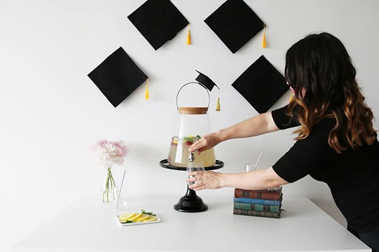 To style this drink, Maggie and I pinned some cloth graduation caps that we had leftover from a shoot to the wall to frame our drink dispenser. We stacked up some cool old books that we use for party decor and set some of our drinks on top of them for different layers of height in our display.