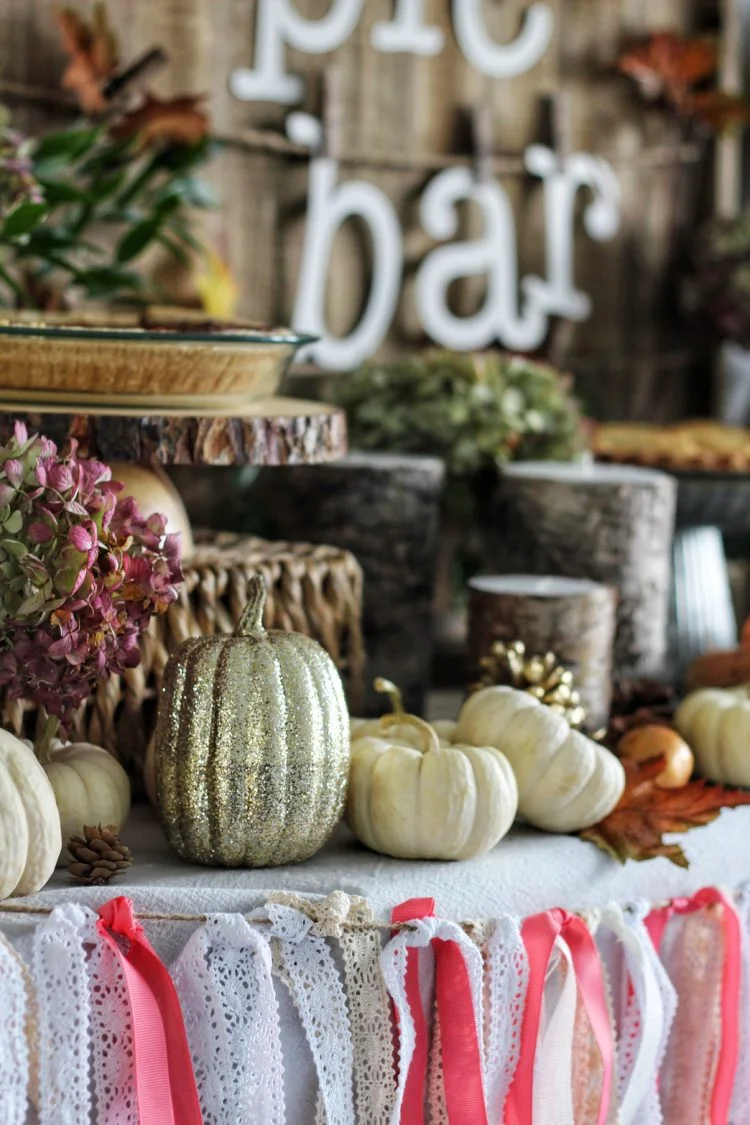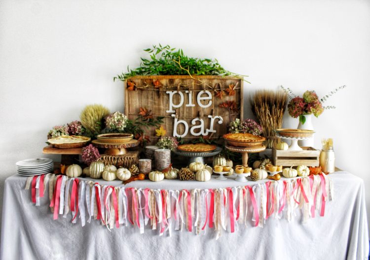 I created a cute DIY project for this bar. An easy garland made with string and different kinds of ribbon. You can put this together in less than 30 minutes and it can be used to decorate just about any area of the house. I strung it across my buffet and it looked so pretty with the Thanksgiving themed Pie Bar.