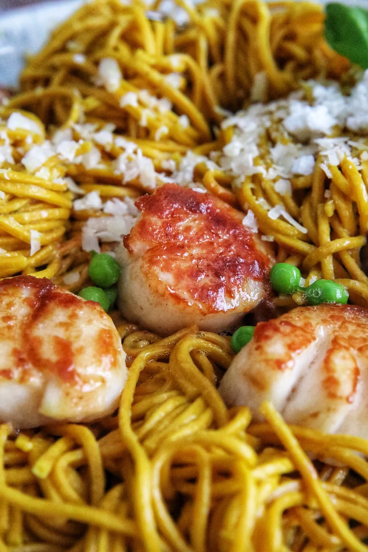 For example, if I just said pasta with scallops would you really get the gist of what's going on in this dish? I would get questions like "why is that pasta yellow" and "is that white stuff cheese or what"?