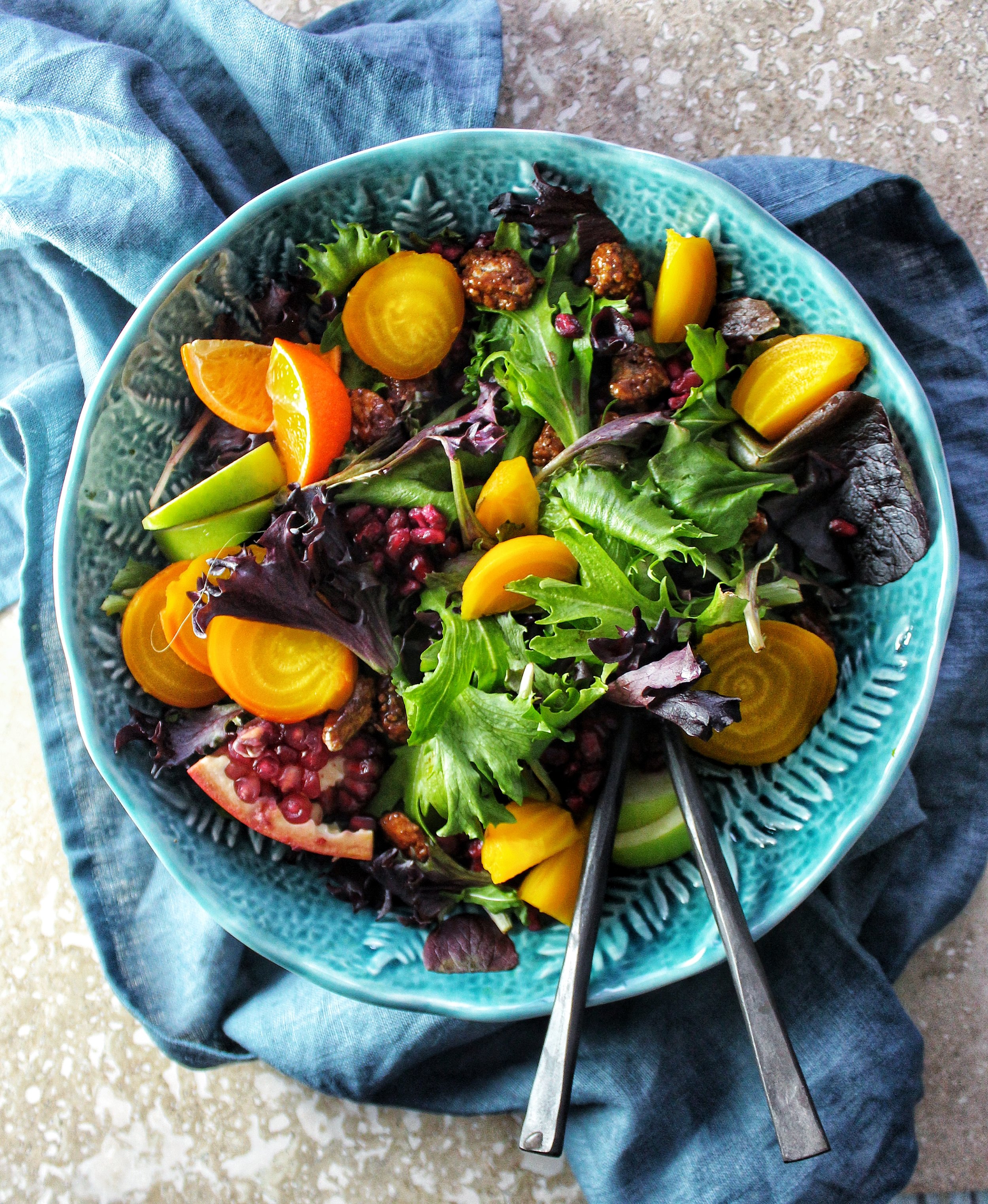Sorry, we were talking about salad and I got sidetracked for a change. I added so much colour into this by including pomegranates, but you have no idea how much they frighten me. Now, I know what you’re thinking. How can fruit be intimidating? I will tell you. It’s because of the “ALL WHITE FACTOR” in my kitchen. If one of those arils goes flying, it’s a done deal. But colour is everything in this recipe, and they were 100% a prerequisite for this salad. Also included in this bowl of heaven are roasted yellow beets, clementines, green apples, mixed greens, candied pecans and crumbled goat cheese.
